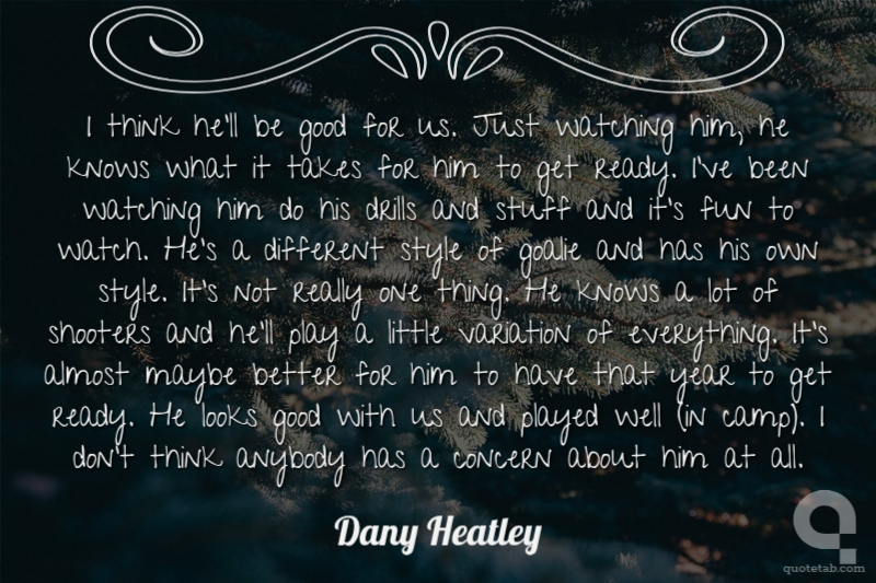 I think he'll be good for us. Just watching him, he knows what it takes for him to get ready. I've been watching him do his drills and stuff and it's fun to watch. He's a different style of goalie and has his own style. It's not really one thing. He knows a lot of shooters and he'll play a little variation of everything. It's almost maybe better for him to have that year to get ready. He looks good with us and played well (in camp). I don't think anybody has a concern about him at all.