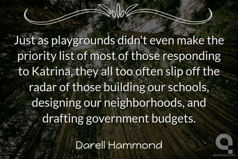 Just as playgrounds didn't even make the priority list of most of those responding to Katrina, they all too often slip off the radar of those building our schools, designing our neighborhoods, and drafting government budgets.
