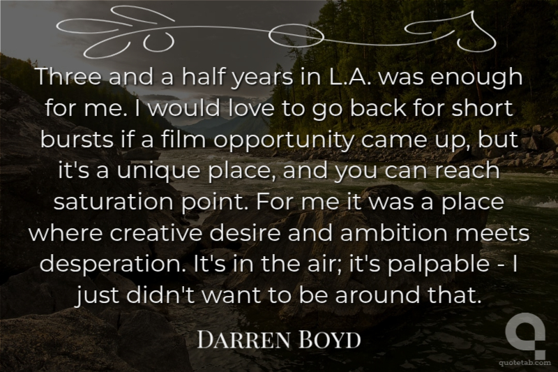 Three and a half years in L.A. was enough for me. I would love to go back for short bursts if a film opportunity came up, but it's a unique place, and you can reach saturation point. For me it was a place where creative desire and ambition meets desperation. It's in the air; it's palpable - I just didn't want to be around that.