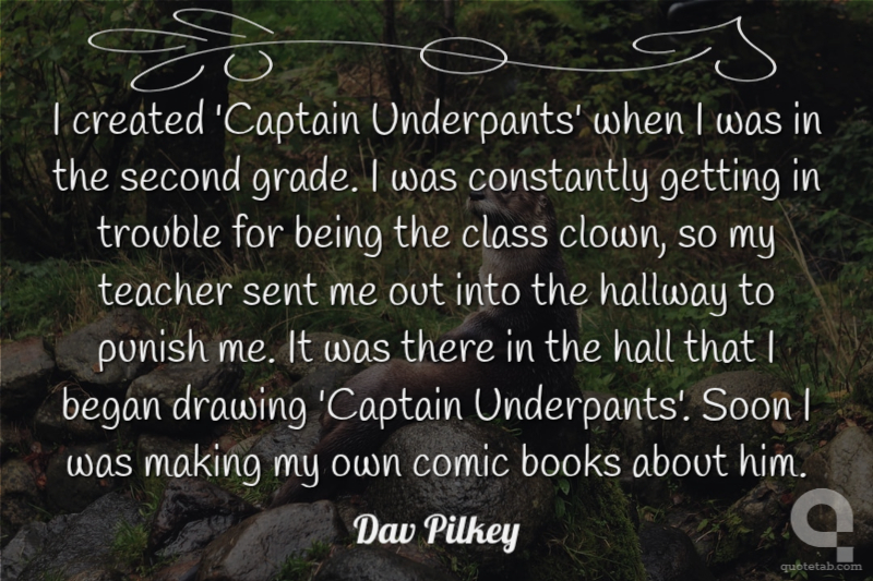 I created 'Captain Underpants' when I was in the second grade. I was constantly getting in trouble for being the class clown, so my teacher sent me out into the hallway to punish me. It was there in the hall that I began drawing 'Captain Underpants'. Soon I was making my own comic books about him.