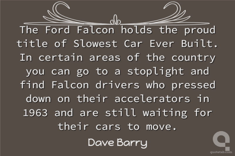 The Ford Falcon holds the proud title of Slowest Car Ever Built. In certain areas of the country you can go to a stoplight and find Falcon drivers who pressed down on their accelerators in 1963 and are still waiting for their cars to move.