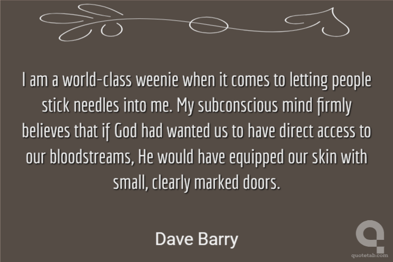 I am a world-class weenie when it comes to letting people stick needles into me. My subconscious mind firmly believes that if God had wanted us to have direct access to our bloodstreams, He would have equipped our skin with small, clearly marked doors.