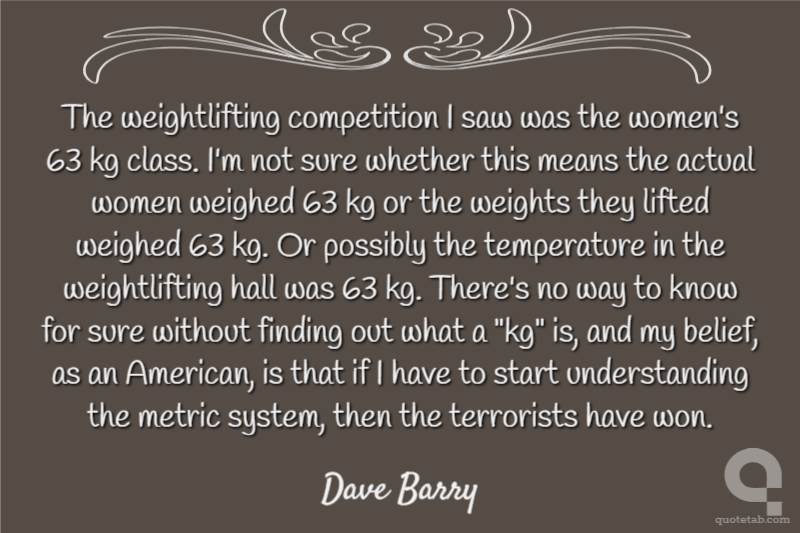 The weightlifting competition I saw was the women's 63 kg class. I'm not sure whether this means the actual women weighed 63 kg or the weights they lifted weighed 63 kg. Or possibly the temperature in the weightlifting hall was 63 kg. There's no way to know for sure without finding out what a "kg" is, and my belief, as an American, is that if I have to start understanding the metric system, then the terrorists have won.