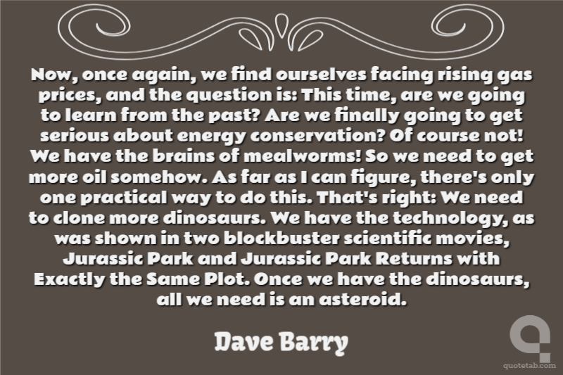 Now, once again, we find ourselves facing rising gas prices, and the question is: This time, are we going to learn from the past? Are we finally going to get serious about energy conservation? Of course not! We have the brains of mealworms! So we need to get more oil somehow. As far as I can figure, there's only one practical way to do this. That's right: We need to clone more dinosaurs. We have the technology, as was shown in two blockbuster scientific movies, Jurassic Park and Jurassic Park Returns with Exactly the Same Plot. Once we have the dinosaurs, all we need is an asteroid.