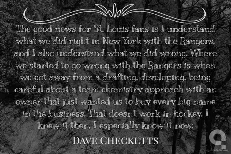 The good news for St. Louis fans is I understand what we did right in New York with the Rangers, and I also understand what we did wrong. Where we started to go wrong with the Rangers is when we got away from a drafting, developing, being careful about a team chemistry approach with an owner that just wanted us to buy every big name in the business. That doesn't work in hockey. I knew it then, I especially know it now.