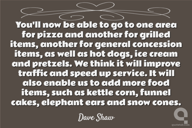You'll now be able to go to one area for pizza and another for grilled items, another for general concession items, as well as hot dogs, ice cream and pretzels. We think it will improve traffic and speed up service. It will also enable us to add more food items, such as kettle corn, funnel cakes, elephant ears and snow cones.