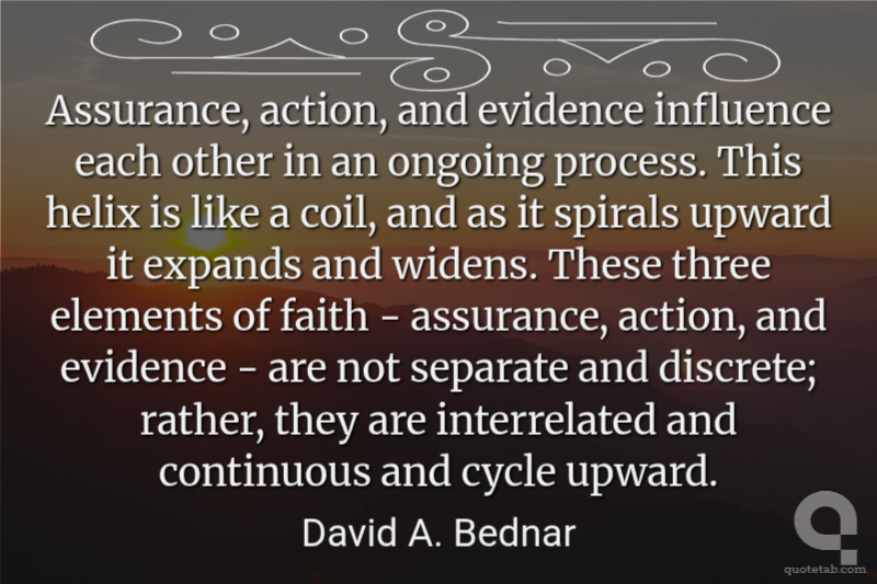 Assurance, action, and evidence influence each other in an ongoing process. This helix is like a coil, and as it spirals upward it expands and widens. These three elements of faith - assurance, action, and evidence - are not separate and discrete; rather, they are interrelated and continuous and cycle upward.
