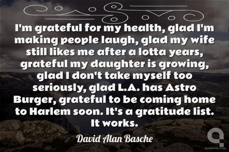 I'm grateful for my health, glad I'm making people laugh, glad my wife still likes me after a lotta years, grateful my daughter is growing, glad I don't take myself too seriously, glad L.A. has Astro Burger, grateful to be coming home to Harlem soon. It's a gratitude list. It works.