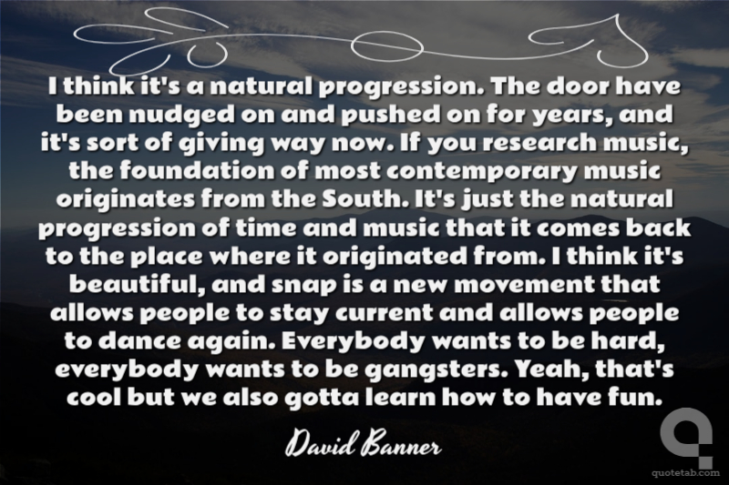 I think it's a natural progression. The door have been nudged on and pushed on for years, and it's sort of giving way now. If you research music, the foundation of most contemporary music originates from the South. It's just the natural progression of time and music that it comes back to the place where it originated from. I think it's beautiful, and snap is a new movement that allows people to stay current and allows people to dance again. Everybody wants to be hard, everybody wants to be gangsters. Yeah, that's cool but we also gotta learn how to have fun.