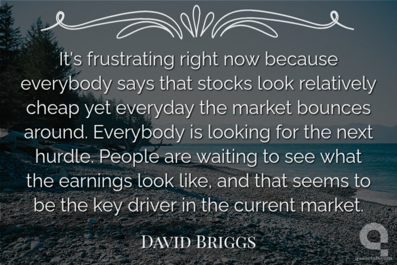 It's frustrating right now because everybody says that stocks look relatively cheap yet everyday the market bounces around. Everybody is looking for the next hurdle. People are waiting to see what the earnings look like, and that seems to be the key driver in the current market.