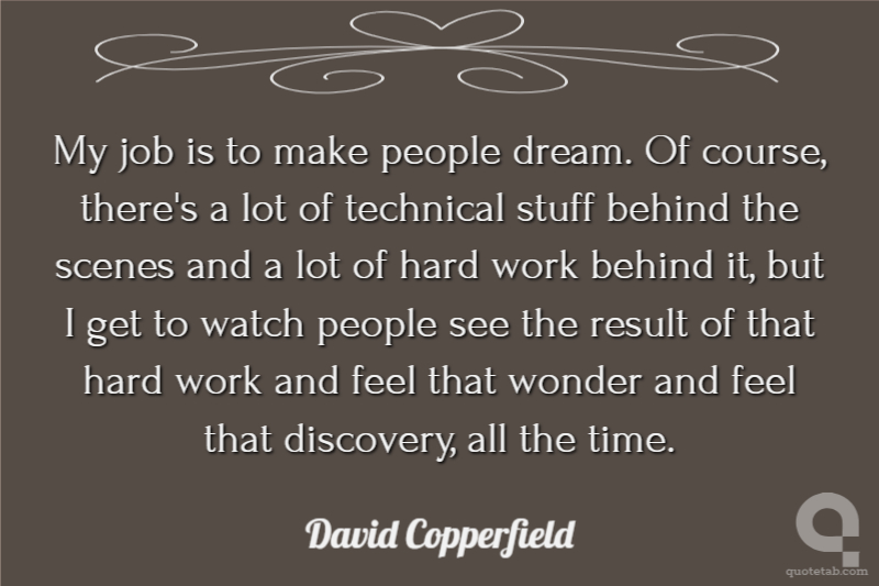 This whole show is about people's dreams, making them come true. The whole basis of it is, nobody dreams of pulling a rabbit out of a hat. Nobody dreams of vanishing the Statue of Liberty unless they're me, but . . . I'll do a whole piece about having your perfect dream car, making cars appear and motorcycles appear ? people dream about that. People dream about traveling, so I'll vanish somebody in the audience and make them appear on the beach in Hawaii during the show, with proof, with signatures, with Polaroid pictures, so they know it's happening in real time.