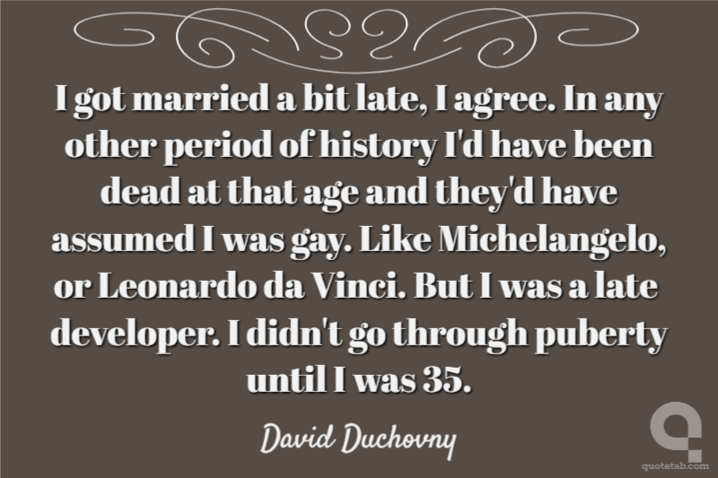 I got married a bit late, I agree. In any other period of history I'd have been dead at that age and they'd have assumed I was gay. Like Michelangelo, or Leonardo da Vinci. But I was a late developer. I didn't go through puberty until I was 35.