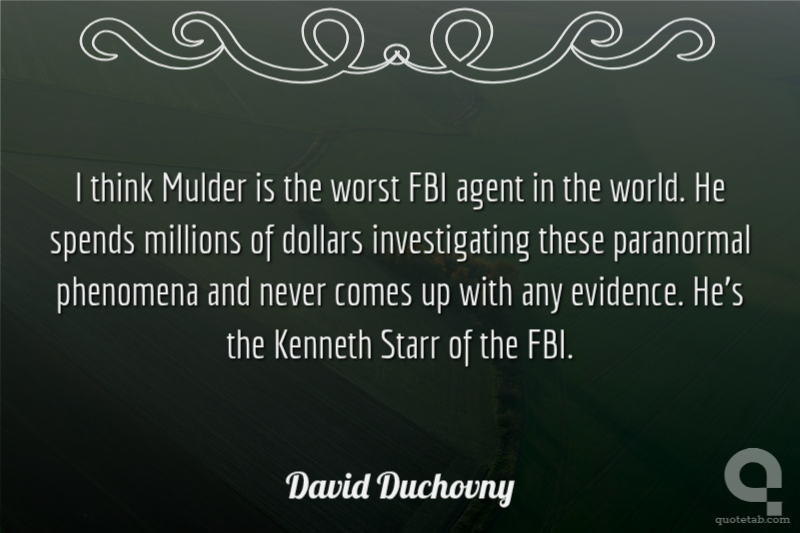 I think Mulder is the worst FBI agent in the world. He spends millions of dollars investigating these paranormal phenomena and never comes up with any evidence. He's the Kenneth Starr of the FBI.