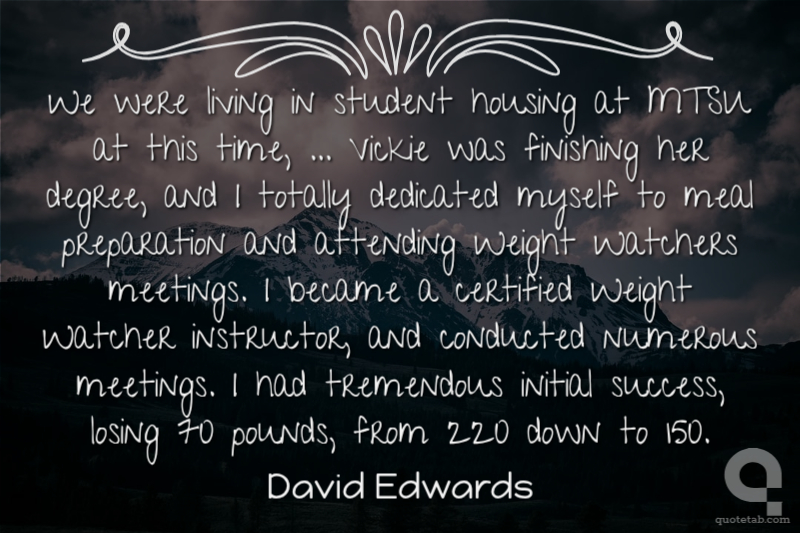 We were living in student housing at MTSU at this time, ... Vickie was finishing her degree, and I totally dedicated myself to meal preparation and attending Weight Watchers meetings. I became a certified Weight Watcher instructor, and conducted numerous meetings. I had tremendous initial success, losing 70 pounds, from 220 down to 150.