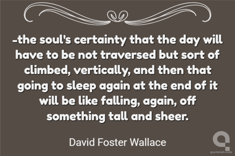 -the soul's certainty that the day will have to be not traversed but sort of climbed, vertically, and then that going to sleep again at the end of it will be like falling, again, off something tall and sheer.