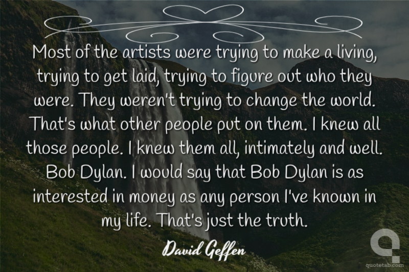 Most of the artists were trying to make a living, trying to get laid, trying to figure out who they were. They weren't trying to change the world. That's what other people put on them. I knew all those people. I knew them all, intimately and well. Bob Dylan. I would say that Bob Dylan is as interested in money as any person I've known in my life. That's just the truth.