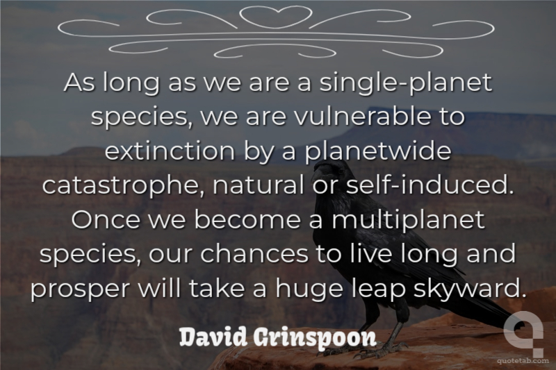 As long as we are a single-planet species, we are vulnerable to extinction by a planetwide catastrophe, natural or self-induced. Once we become a multiplanet species, our chances to live long and prosper will take a huge leap skyward.