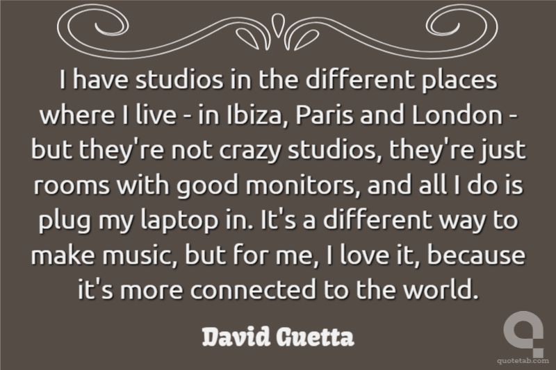 I have studios in the different places where I live - in Ibiza, Paris and London - but they're not crazy studios, they're just rooms with good monitors, and all I do is plug my laptop in. It's a different way to make music, but for me, I love it, because it's more connected to the world.