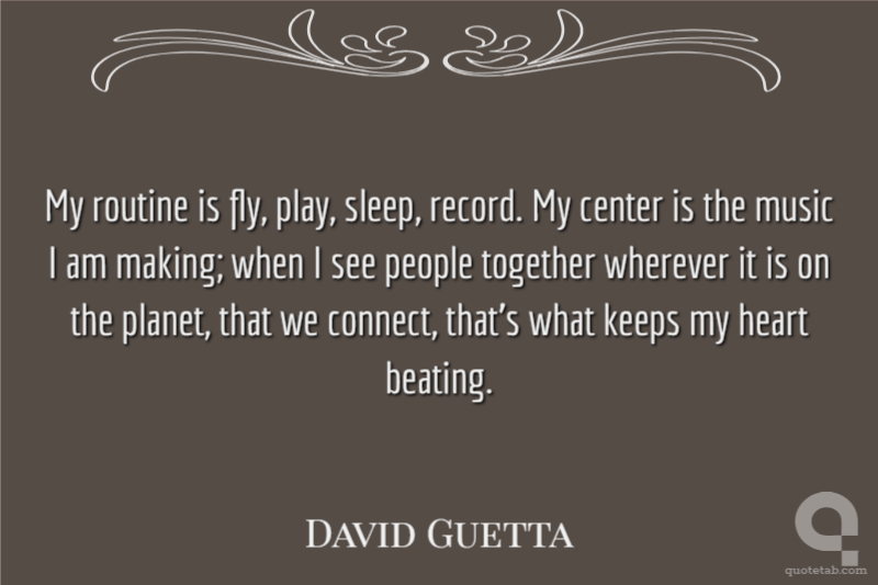 My routine is fly, play, sleep, record. My center is the music I am making; when I see people together wherever it is on the planet, that we connect, that's what keeps my heart beating.