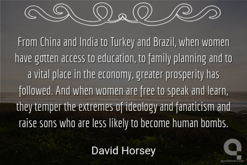 From China and India to Turkey and Brazil, when women have gotten access to education, to family planning and to a vital place in the economy, greater prosperity has followed. And when women are free to speak and learn, they temper the extremes of ideology and fanaticism and raise sons who are less likely to become human bombs.