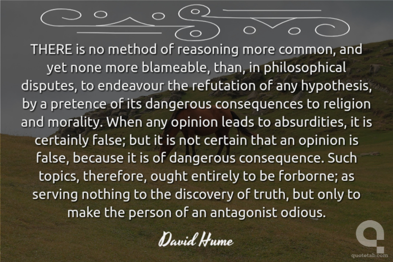 THERE is no method of reasoning more common, and yet none more blameable, than, in philosophical disputes, to endeavour the refutation of any hypothesis, by a pretence of its dangerous consequences to religion and morality. When any opinion leads to absurdities, it is certainly false; but it is not certain that an opinion is false, because it is of dangerous consequence. Such topics, therefore, ought entirely to be forborne; as serving nothing to the discovery of truth, but only to make the person of an antagonist odious.