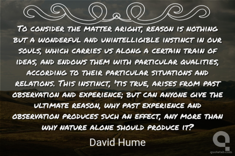 To consider the matter aright, reason is nothing but a wonderful and unintelligible instinct in our souls, which carries us along a certain train of ideas, and endows them with particular qualities, according to their particular situations and relations. This instinct, 'tis true, arises from past observation and experience; but can anyone give the ultimate reason, why past experience and observation produces such an effect, any more than why nature alone should produce it?
