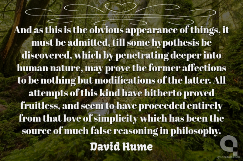 And as this is the obvious appearance of things, it must be admitted, till some hypothesis be discovered, which by penetrating deeper into human nature, may prove the former affections to be nothing but modifications of the latter. All attempts of this kind have hitherto proved fruitless, and seem to have proceeded entirely from that love of simplicity which has been the source of much false reasoning in philosophy.