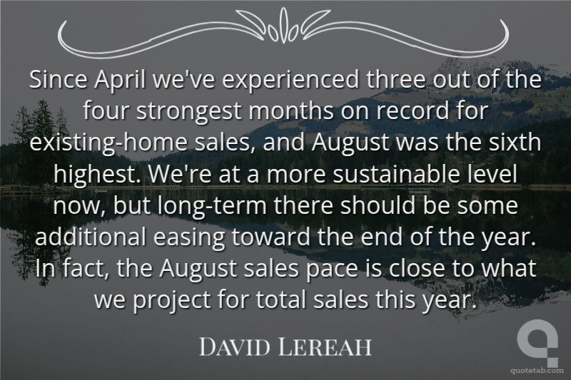 Since April we've experienced three out of the four strongest months on record for existing-home sales, and August was the sixth highest. We're at a more sustainable level now, but long-term there should be some additional easing toward the end of the year. In fact, the August sales pace is close to what we project for total sales this year.