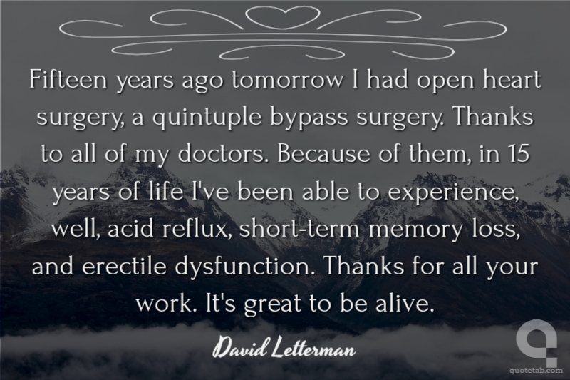 Fifteen years ago tomorrow I had open heart surgery, a quintuple bypass surgery. Thanks to all of my doctors. Because of them, in 15 years of life I've been able to experience, well, acid reflux, short-term memory loss, and erectile dysfunction. Thanks for all your work. It's great to be alive.