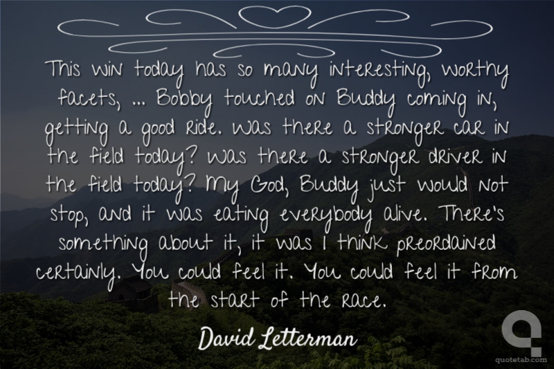 This win today has so many interesting, worthy facets, ... Bobby touched on Buddy coming in, getting a good ride. Was there a stronger car in the field today? Was there a stronger driver in the field today? My God, Buddy just would not stop, and it was eating everybody alive. There's something about it, it was I think preordained certainly. You could feel it. You could feel it from the start of the race.