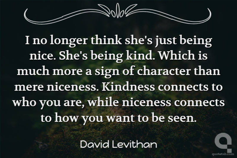 I no longer think she's just being nice. She's being kind. Which is much more a sign of character than mere niceness. Kindness connects to who you are, while niceness connects to how you want to be seen.