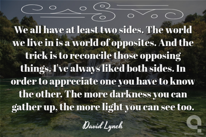 We all have at least two sides. The world we live in is a world of opposites. And the trick is to reconcile those opposing things. I've always liked both sides. In order to appreciate one you have to know the other. The more darkness you can gather up, the more light you can see too.