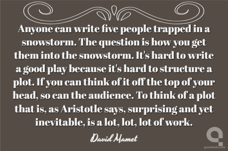 Anyone can write five people trapped in a snowstorm. The question is how you get them into the snowstorm. It's hard to write a good play because it's hard to structure a plot. If you can think of it off the top of your head, so can the audience. To think of a plot that is, as Aristotle says, surprising and yet inevitable, is a lot, lot, lot of work.