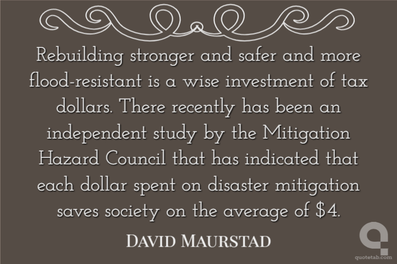 Rebuilding stronger and safer and more flood-resistant is a wise investment of tax dollars. There recently has been an independent study by the Mitigation Hazard Council that has indicated that each dollar spent on disaster mitigation saves society on the average of $4.