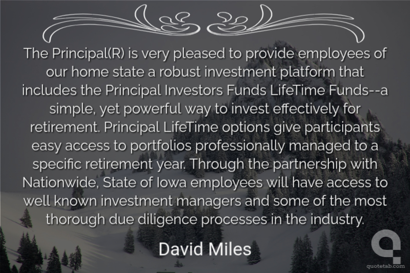 The Principal(R) is very pleased to provide employees of our home state a robust investment platform that includes the Principal Investors Funds LifeTime Funds--a simple, yet powerful way to invest effectively for retirement. Principal LifeTime options give participants easy access to portfolios professionally managed to a specific retirement year. Through the partnership with Nationwide, State of Iowa employees will have access to well known investment managers and some of the most thorough due diligence processes in the industry.