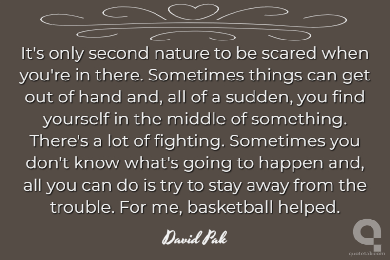 It's only second nature to be scared when you're in there. Sometimes things can get out of hand and, all of a sudden, you find yourself in the middle of something. There's a lot of fighting. Sometimes you don't know what's going to happen and, all you can do is try to stay away from the trouble. For me, basketball helped.