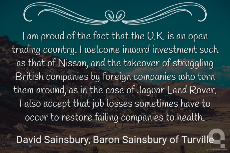 I am proud of the fact that the U.K. is an open trading country. I welcome inward investment such as that of Nissan, and the takeover of struggling British companies by foreign companies who turn them around, as in the case of Jaguar Land Rover. I also accept that job losses sometimes have to occur to restore failing companies to health.