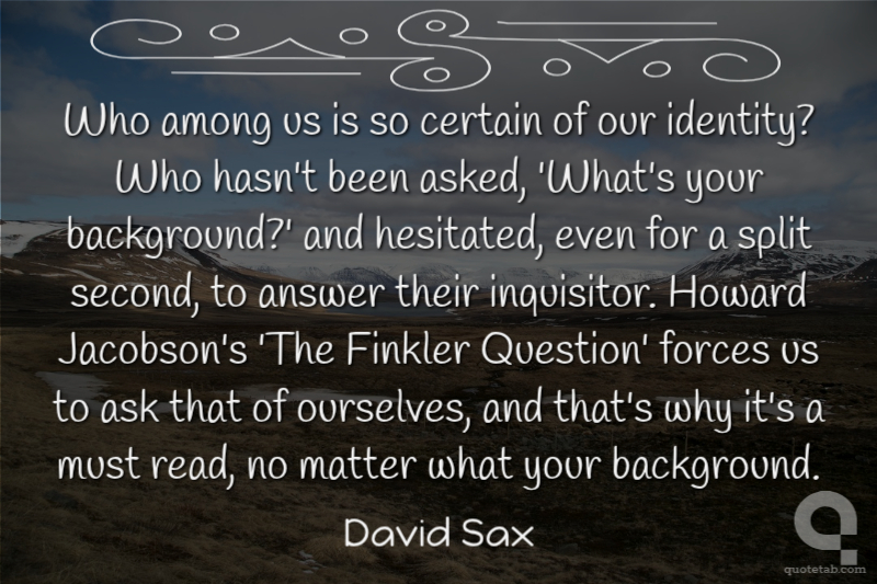 Who among us is so certain of our identity? Who hasn't been asked, 'What's your background?' and hesitated, even for a split second, to answer their inquisitor. Howard Jacobson's 'The Finkler Question' forces us to ask that of ourselves, and that's why it's a must read, no matter what your background.
