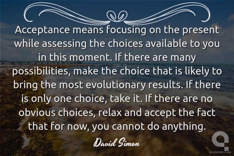 Acceptance means focusing on the present while assessing the choices available to you in this moment. If there are many possibilities, make the choice that is likely to bring the most evolutionary results. If there is only one choice, take it. If there are no obvious choices, relax and accept the fact that for now, you cannot do anything.