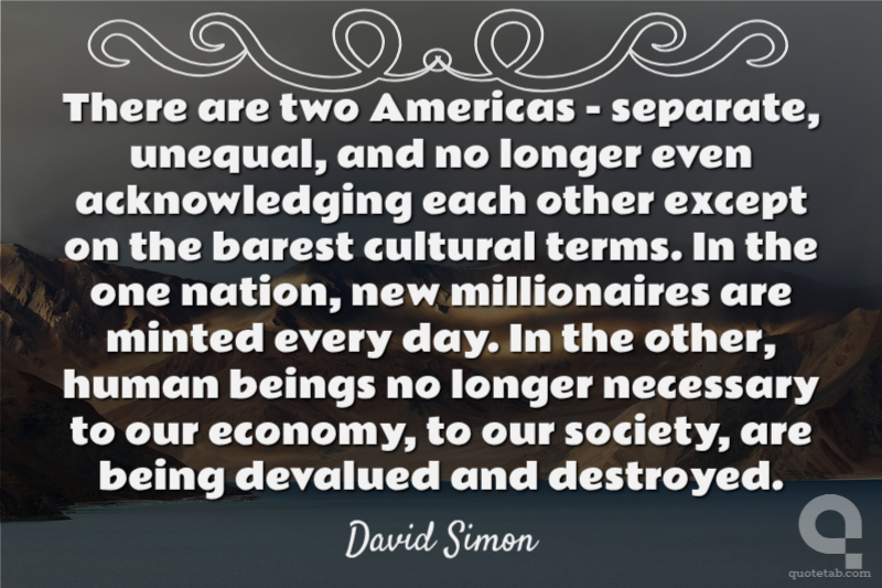 There are two Americas - separate, unequal, and no longer even acknowledging each other except on the barest cultural terms. In the one nation, new millionaires are minted every day. In the other, human beings no longer necessary to our economy, to our society, are being devalued and destroyed.