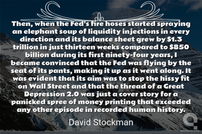 Then, when the Fed's fire hoses started spraying an elephant soup of liquidity injections in every direction and its balance sheet grew by $1.3 trillion in just thirteen weeks compared to $850 billion during its first ninety-four years, I became convinced that the Fed was flying by the seat of its pants, making it up as it went along. It was evident that its aim was to stop the hissy fit on Wall Street and that the thread of a Great Depression 2.0 was just a cover story for a panicked spree of money printing that exceeded any other episode in recorded human history.