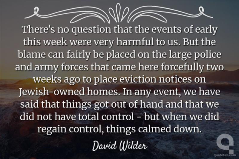 There's no question that the events of early this week were very harmful to us. But the blame can fairly be placed on the large police and army forces that came here forcefully two weeks ago to place eviction notices on Jewish-owned homes. In any event, we have said that things got out of hand and that we did not have total control - but when we did regain control, things calmed down.