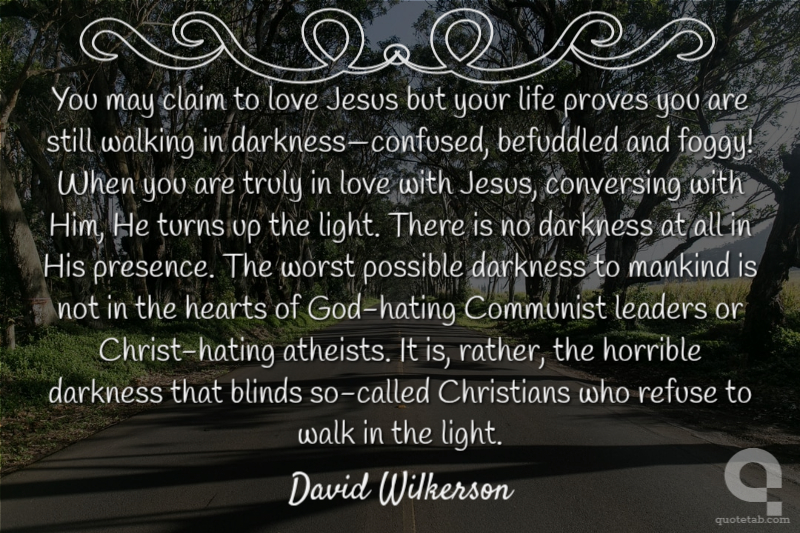 You may claim to love Jesus but your life proves you are still walking in darkness—confused, befuddled and foggy! When you are truly in love with Jesus, conversing with Him, He turns up the light. There is no darkness at all in His presence. The worst possible darkness to mankind is not in the hearts of God-hating Communist leaders or Christ-hating atheists. It is, rather, the horrible darkness that blinds so-called Christians who refuse to walk in the light.