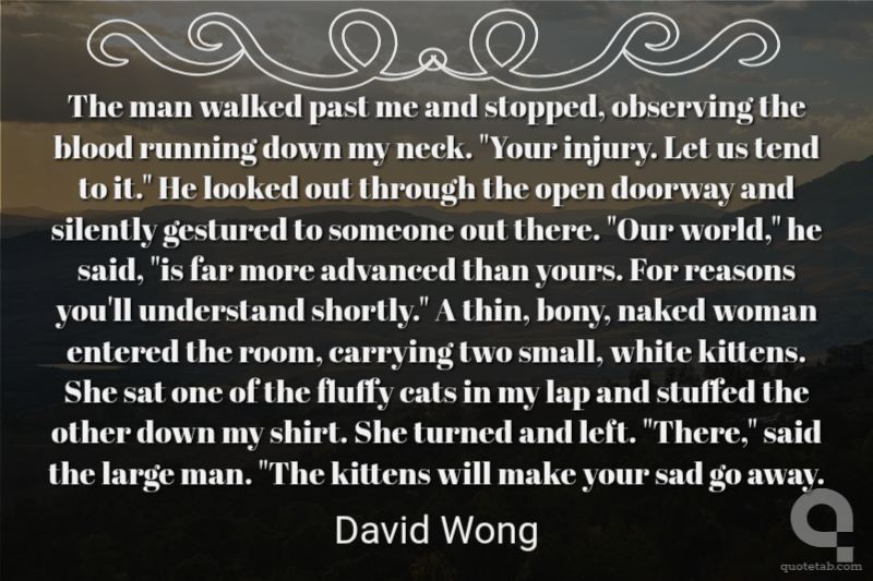 The man walked past me and stopped, observing the blood running down my neck. "Your injury. Let us tend to it." He looked out through the open doorway and silently gestured to someone out there. "Our world," he said, "is far more advanced than yours. For reasons you'll understand shortly." A thin, bony, naked woman entered the room, carrying two small, white kittens. She sat one of the fluffy cats in my lap and stuffed the other down my shirt. She turned and left. "There," said the large man. "The kittens will make your sad go away.