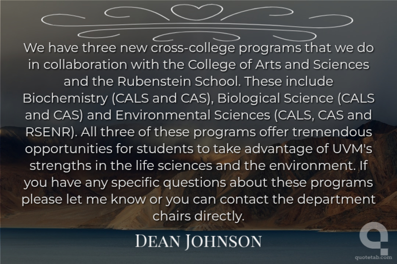 We have three new cross-college programs that we do in collaboration with the College of Arts and Sciences and the Rubenstein School. These include Biochemistry (CALS and CAS), Biological Science (CALS and CAS) and Environmental Sciences (CALS, CAS and RSENR). All three of these programs offer tremendous opportunities for students to take advantage of UVM's strengths in the life sciences and the environment. If you have any specific questions about these programs please let me know or you can contact the department chairs directly.