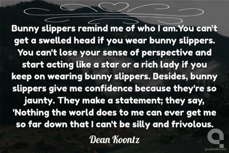 Bunny slippers remind me of who I am. You can't get a swelled head if you wear bunny slippers. You can't lose your sense of perspective and start acting like a star or a rich lady if you keep on wearing bunny slippers. Besides, bunny slippers give me confidence because they're so jaunty. They make a statement; they say, 'Nothing the world does to me can ever get me so far down that I can't be silly and frivolous.' If I died and found myself in Hell, I could endure the place if I had bunny slippers.