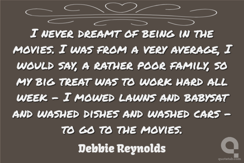 I never dreamt of being in the movies. I was from a very average, I would say, a rather poor family, so my big treat was to work hard all week - I mowed lawns and babysat and washed dishes and washed cars - to go to the movies.