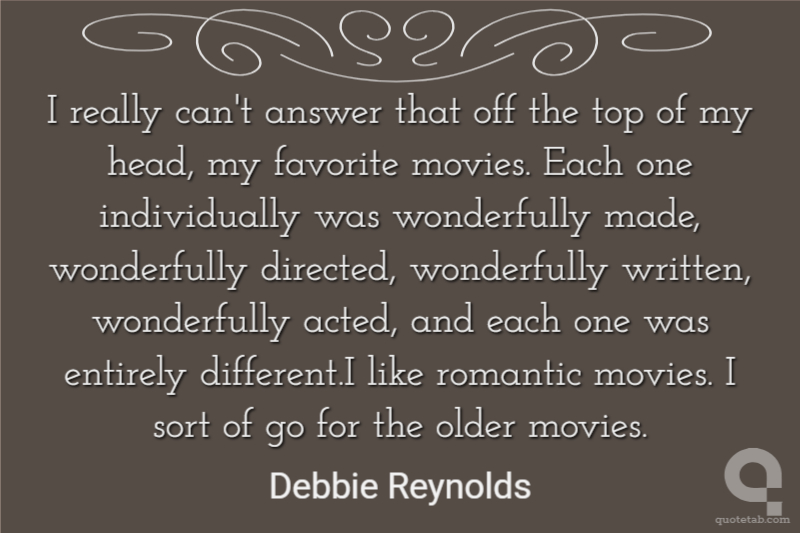 I really can't answer that off the top of my head, my favorite movies. Each one individually was wonderfully made, wonderfully directed, wonderfully written, wonderfully acted, and each one was entirely different.I like romantic movies. I sort of go for the older movies.