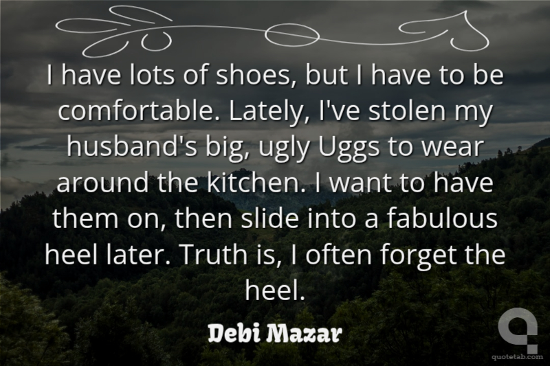 I have lots of shoes, but I have to be comfortable. Lately, I've stolen my husband's big, ugly Uggs to wear around the kitchen. I want to have them on, then slide into a fabulous heel later. Truth is, I often forget the heel.