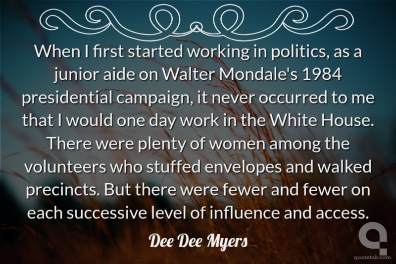 When I first started working in politics, as a junior aide on Walter Mondale's 1984 presidential campaign, it never occurred to me that I would one day work in the White House. There were plenty of women among the volunteers who stuffed envelopes and walked precincts. But there were fewer and fewer on each successive level of influence and access.